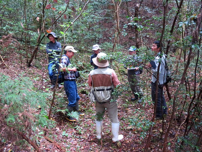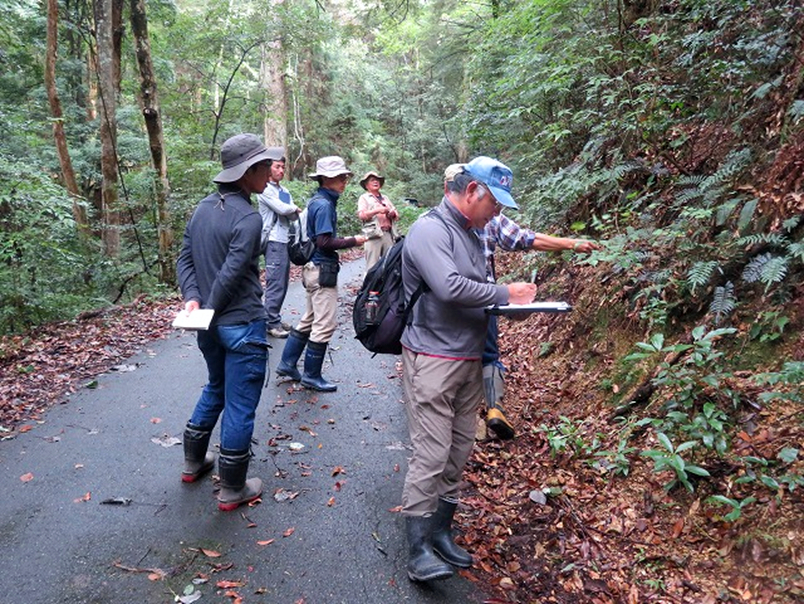 講師から岡山県の地質や植生の大きな変化、県内に自生する貴重植物などについて学習しました。また、「本山モミ・ツガ・クリ等遺伝資源希少個体群保護林」へ移動し、モミ、ツガ、スダジイ、アカガシ、ツクバネガシ、ウラジロガシ、ハイノキ、カゴノキ、ユズリハ、ネコノチチ、ウラジロノキなどの植物観察を行いました。